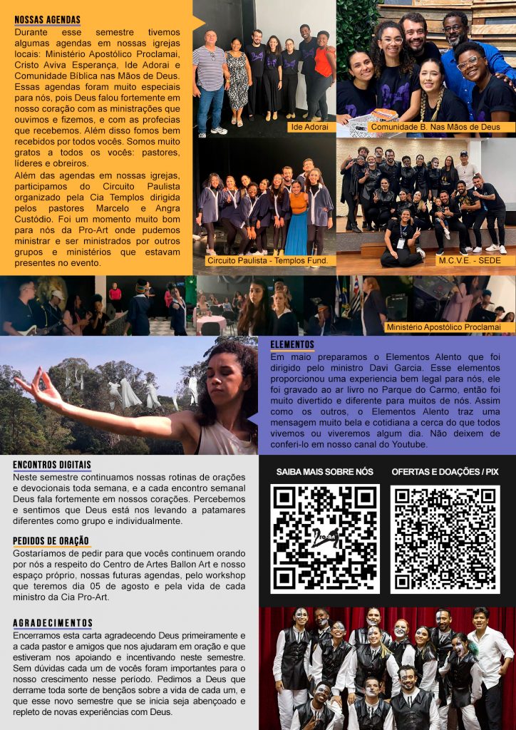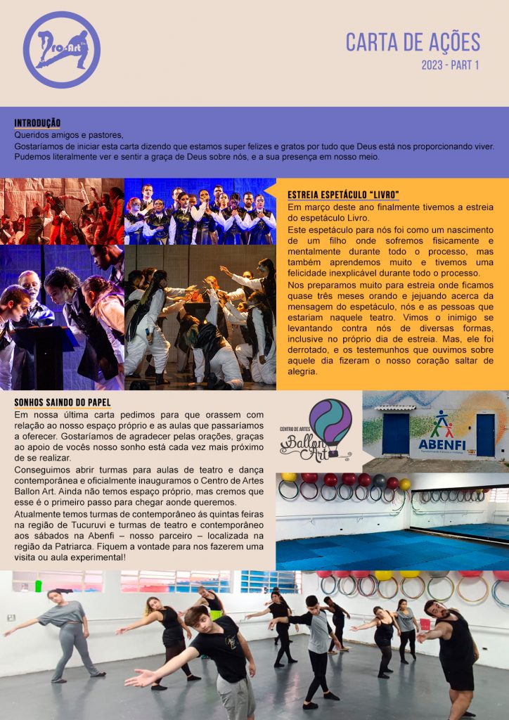 Gostaríamos de pedir para que vocês continuem orando por nós a respeito do Centro de Artes Ballon Art e nosso espaço próprio, nossas futuras agendas, pelo workshop que teremos dia 05 de Agosto e pela vida de cada ministro da Cia Pro-Art.