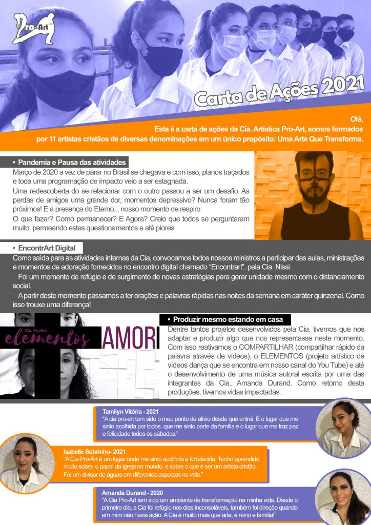 Esta é a carta de ações da Cia. Artística Pro-Art, somos formados por 11 artistas cristãos de diversas denominações em um único propósito: Uma Arte Que Transforma.