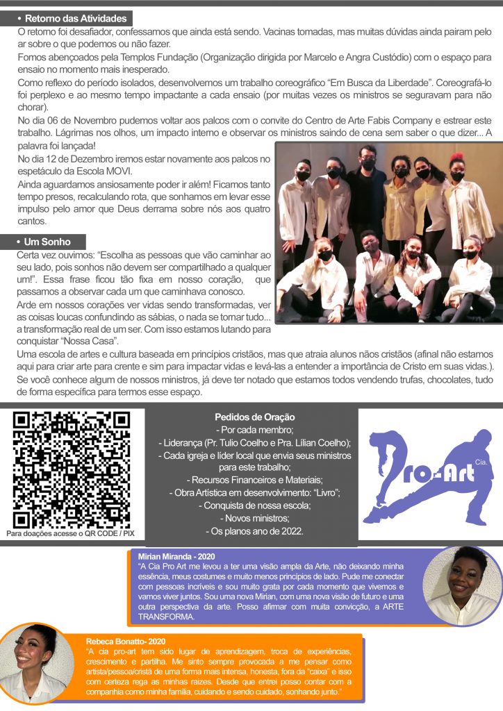 A Cia Pro-Art tem sido um ambiente de transformação na minha vida. Desde o primeiro dia, a Cia foi refúgio nos dias inconsoláveis, também foi direção quando em mim não havia ação. A Cia é muito mais que arte, é reino e família!